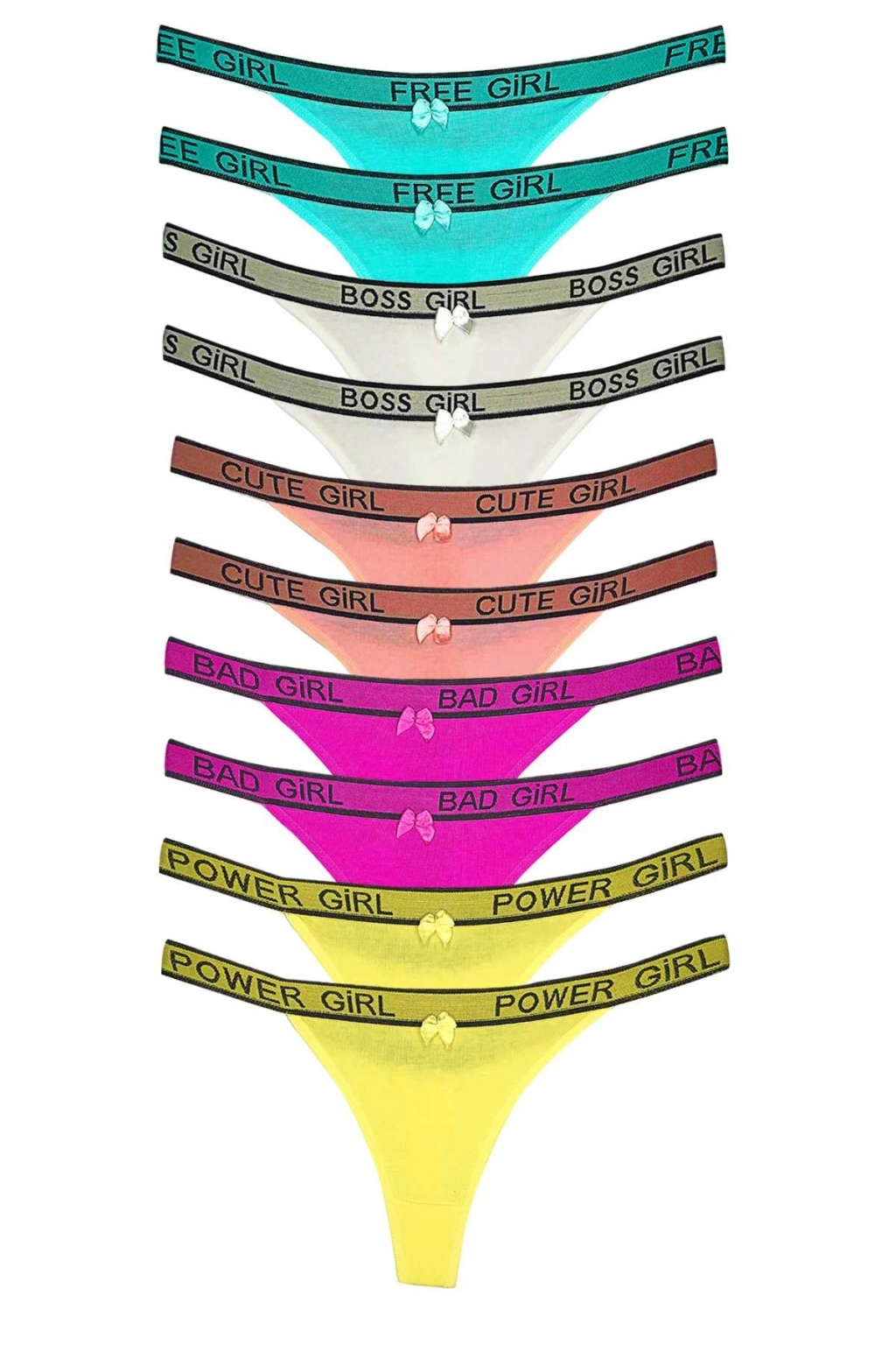 | 10 Adet Beli Yazılı Pamuk Kadın Tanga String Külot Beli Yazılı Tanga modeli kadın string külot kalın bel lastikleri sayesinde üzerinize tam oturarak kayma yapmaz. Rahat bel yapısı sayesinde günlük hayat kullanımına uygundur. Yaz aylarında plaj ve havuz başlarında pareo altından kullanılabilir. Farklı bir tarz oluşturmak isteyen kadınların ve gençlerin tercihidir. Ağ kısmındaki ekstra pamuklu kumaş sayesinde gündelik hayatın koşturmasında rahatsızlık hissi vermez ve tahriş etmez. Sağlığınız için iç giyimde pamuklu ürünleri tercih ediniz. Kadın iç giyimde en çok tercih edilen tanga modellerinin arasında yer almaktadır. Her rengin bel yazısı farklıdır. Beyaz renkli tanga bel yazısı Boss Girl Mavi renkli tanga bel yazısı Free Girl Sarı Renkli tanga bel yazısı Power Girl Mor Renkli tanga bel yazısı Bad Girl Pudra Renkli Tanha Bel Yazısı Cute Girl 5 farklı renk ürün göndeirlecektir. Renkler Beyaz, Mavi , Sarı , Mor , Pudra. Ürün bileşenleri % 92 Pamuk % 8 Likradır. Royaleks ailesi olarak güzel ve mutlu günlerde kullanmanızı temenni ederiz. Yıkama tailmatlarına uyulduğunda deforme olmaz. 40 derecenin altında yıkayınız. Paket içeriği; 10 Adet Beli Yazılı Pamuk Kadın Tanga String Külot |