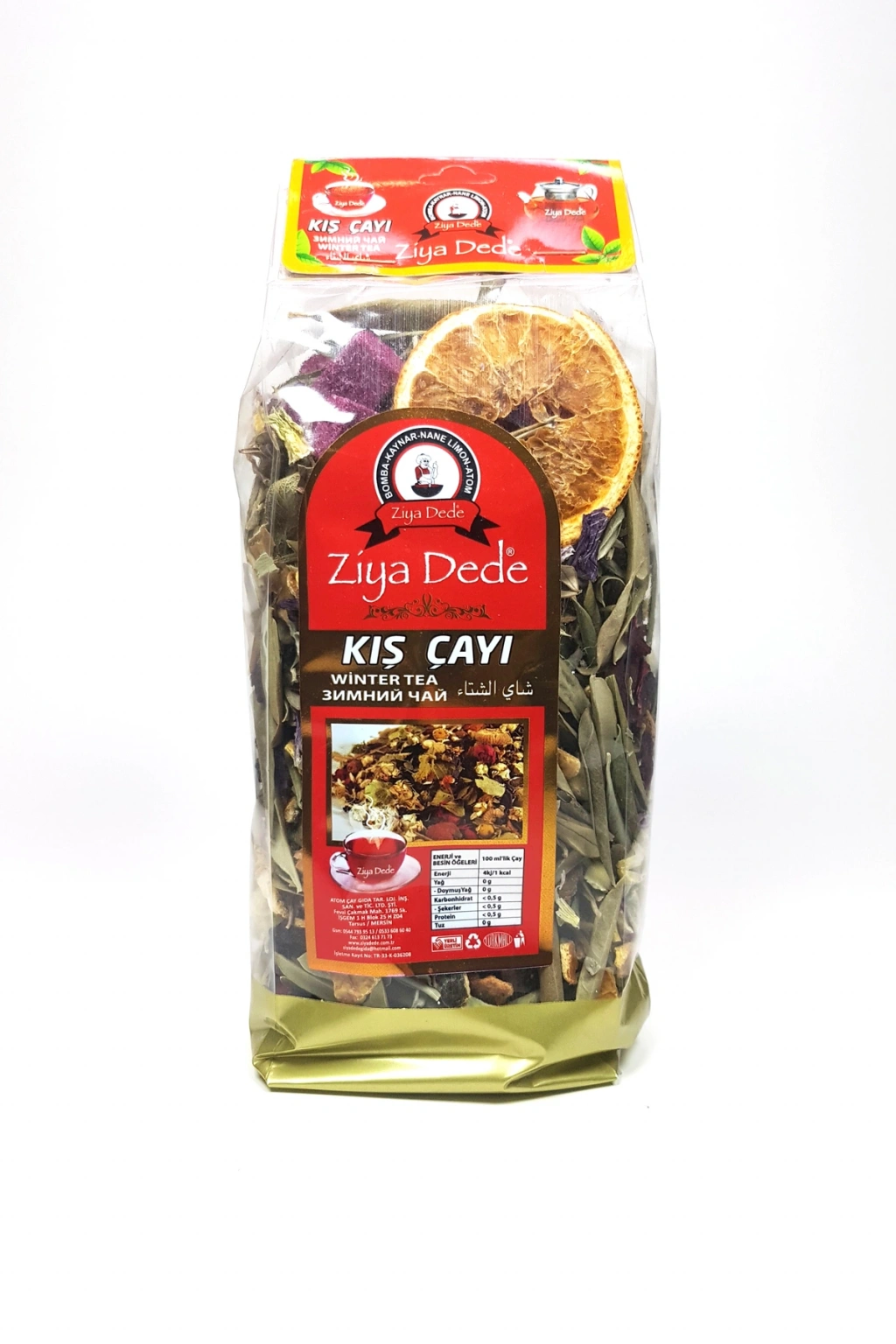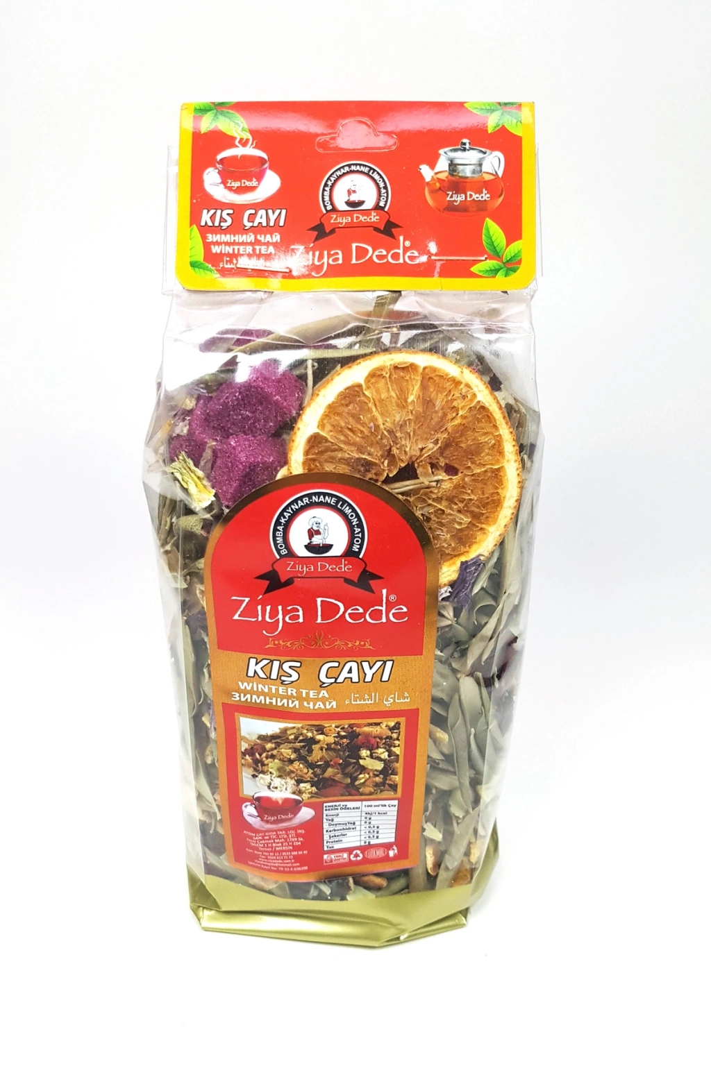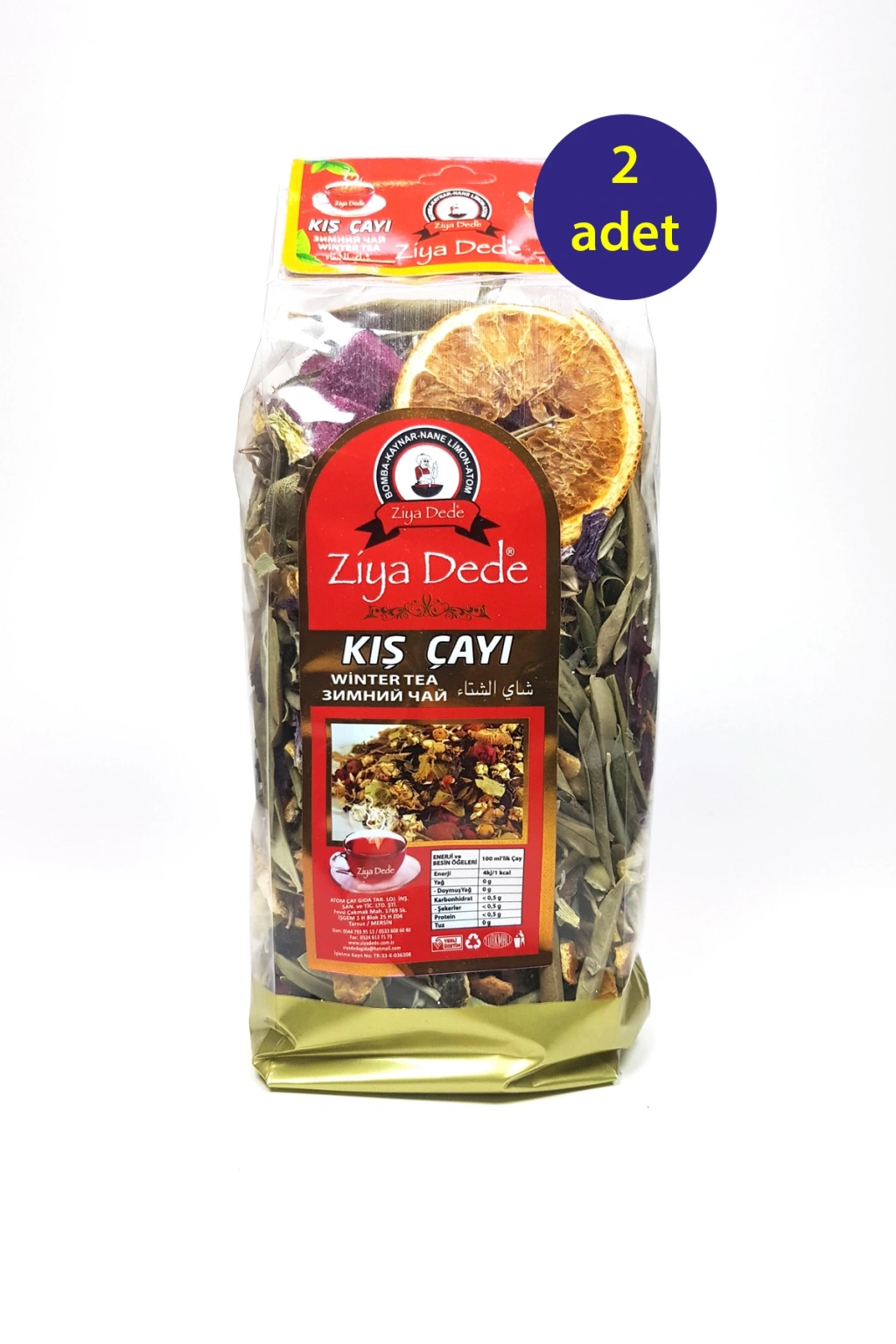 | 2 Adet Ziya Dede Bomba Özel Kış Çayı 200 Gr 12 li Karışım İçeriği : Hibiskus, Portakal Kabuğu, Nar Çiçeği, Mersin Yaprağı, Ada Çayı, Htmi Çiçeği, Zeytin Yaprağı, Nar Kabuğu, Okaliptus, Kekik, Papatya, Atom Çayı. Kullanım Şekli: Karışımı oluşturan bütün bitkilerden bir avuç kadar alınıp demlenir. 5 dakika bekletildikten sonra tüketilir. |