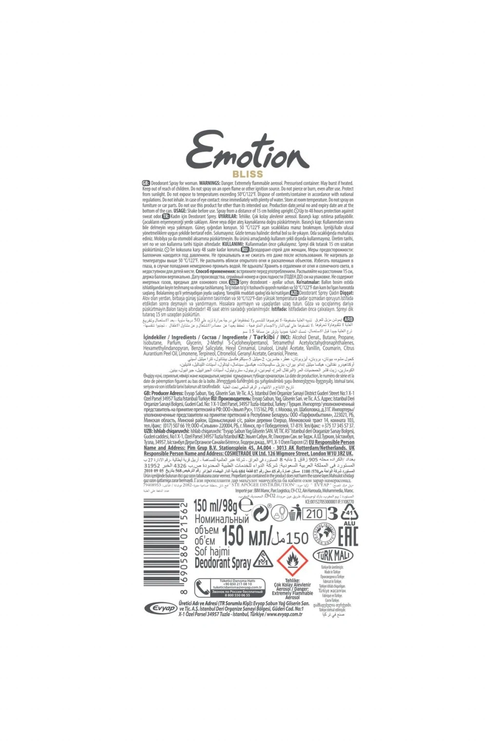 Emotion Bliss, özel tasarımlı sprey tüp ambalajı ile kutusuz olarak gönderilecektir. Ürün üzerinde marka ve içerik bilgileri yer almakta olup, doğrudan kullanıma hazır şekilde