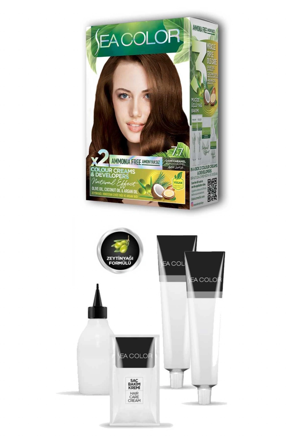 | Sea Color 2X2 tüp Krem Saç Boyası Seti Koyu Karamel No:7.7 Zeytinyağlı özel formülü ile saçlarınızı boyarken ışıldayan saçlar elde edebilirsiniz. Canlandırıcı ve saç besleyici özelliğe sahiptir. Zengin renk seçeneğine sahip sea color tüp krem boya kalıcı, parlak ve ışıltıtılı saç boyası isteyenler için idealdir. Mükemmel beyaz kapama sayesinde dip boyalarınızda ve tüm boyamalarda gönül rahatlığı ile kullanabilirsiniz. Krem boya formülündeki özel kondisyonerler ile parlak ve canlı renkler, kusursuz beyaz kapama özelliği ve içerisindeki yoğun pigmentlerle solmayan renkler elde edebilirsiniz. Güneşte saçlarınızın ışıltısı göz alıcı olacak ve tüm dikkatleri üstünüze çekeceksiniz. Paket içerisinde bulunan saç bakım kremi sayesinde yumuşaklık ve ipeksi parlak görünüm sağlar. Kullanma prospektüsü kutunun iç kısmına basılıdır ilk defa kullanım için detaylı anlatım mevcuttur. Kutu üzerindeki OR kodunu telefonunuzdan okutarak uygulama videosuna da ulaşabilirsiniz. Işıltılı sağlıklı ve parlak saçlar için sea color tüp krem boya en ideal seçenek olacaktır. Mutlu ve güzel günlerde kullanmanız dileğiyle. Kutu içeriği: 2X2 adet tüp krem saç boyası ( 2x50 ml) 2X1 oksidan krem (75 ml) 2X1 saç bakım kremi ( 10 ml) 2X1 çift saç boyama eldiveni |