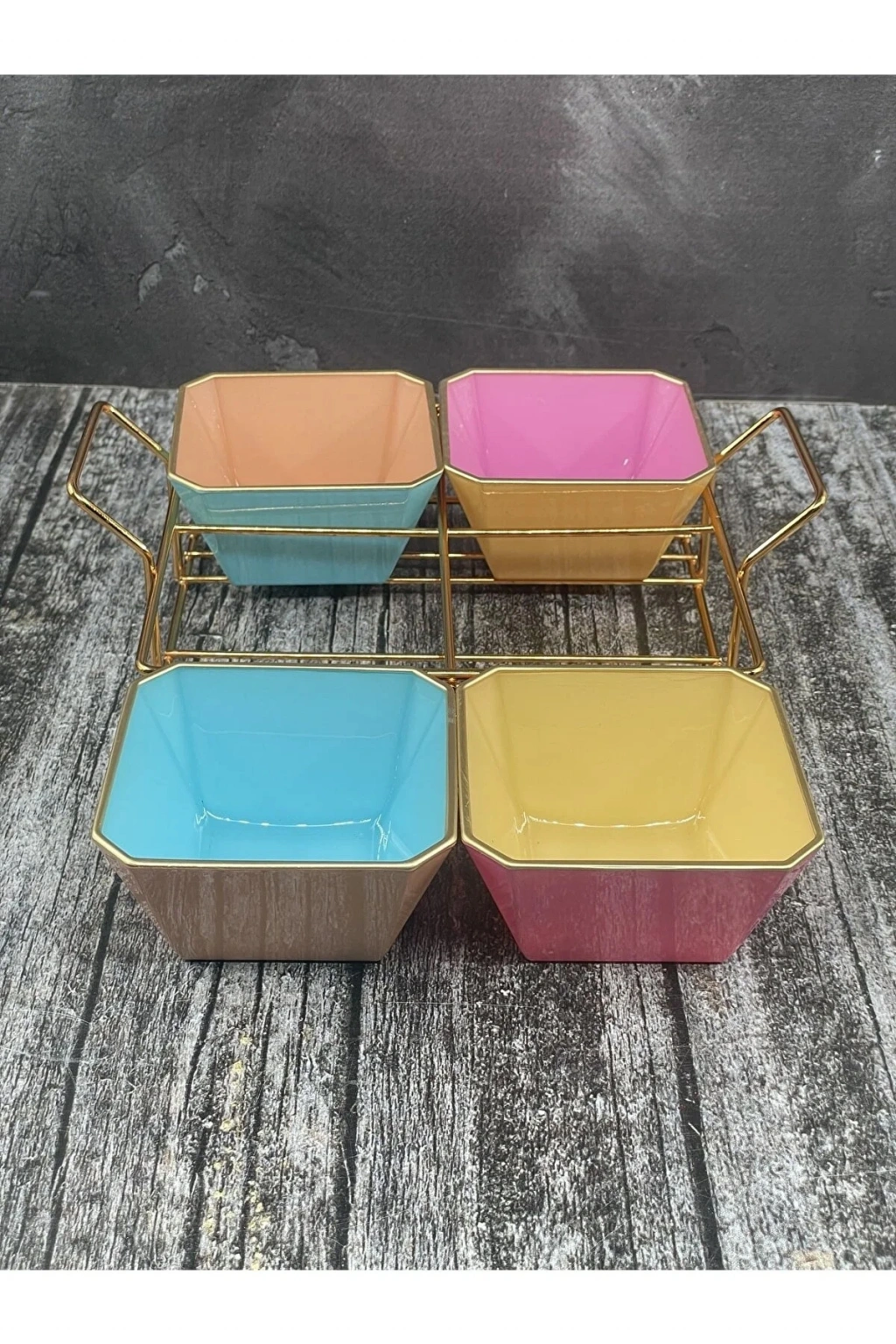 4 Bölmeli Gold Standlı Cam Kahvaltılık Çerezlik Sunumluk Renkli