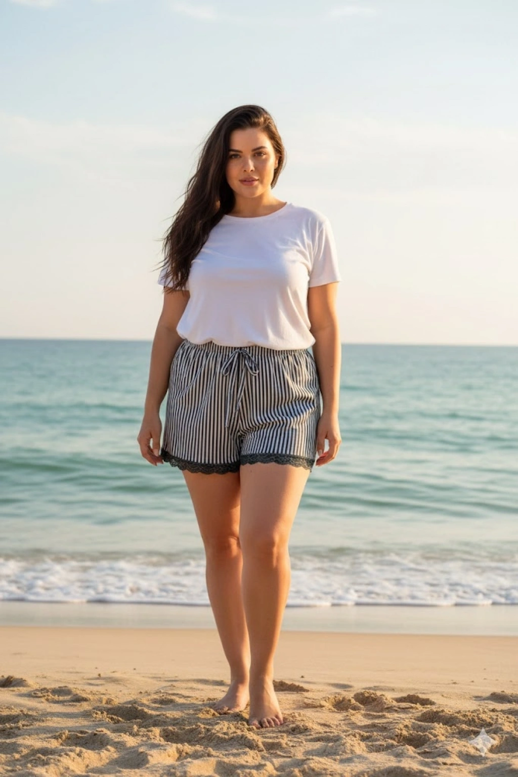 Çizgili Penye Kadın Ev Şortu Bacak Dantel Detaylı Ev Giyim Kahverengi