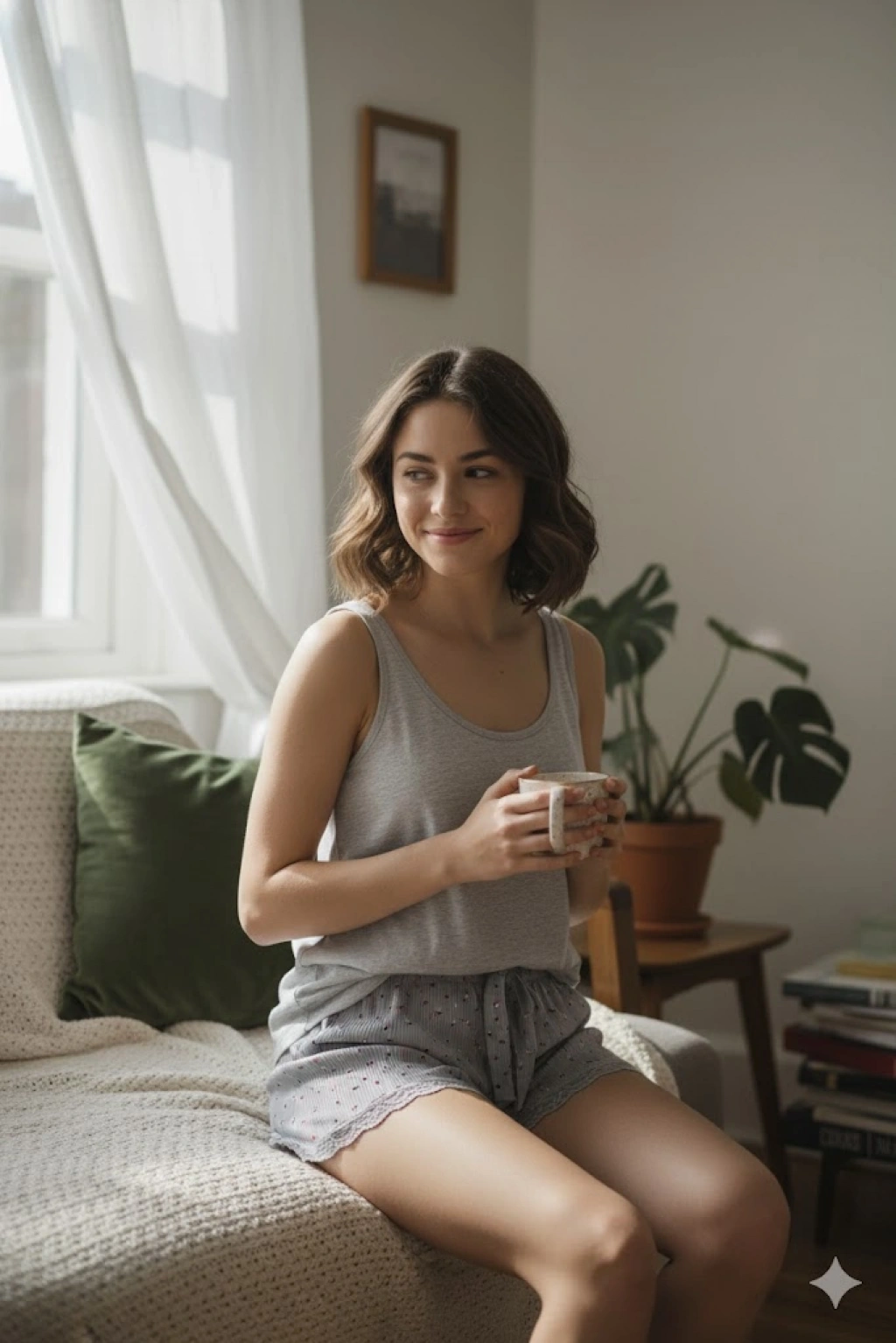 Bambu Fitilli Kadın Ev Şortu Bacak Dantel Detaylı Ev Giyim Taba