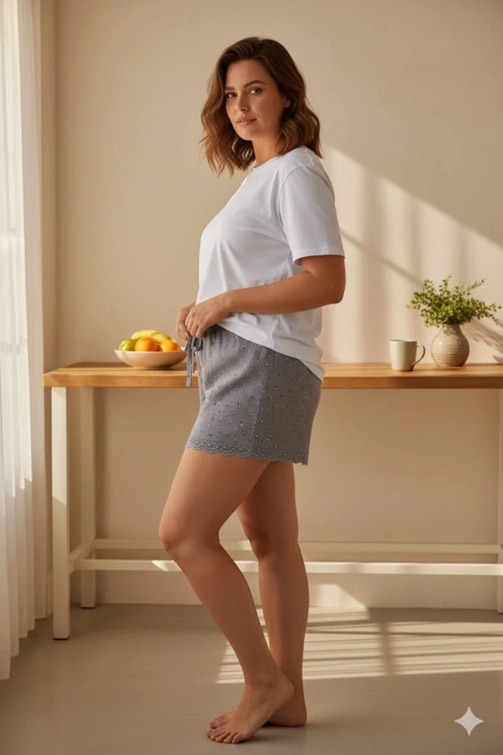 Düz Renk Mini Çiçek Desenli Penye Kadın Ev Şortu Bacak Dantel Detaylı Ev Giyim Gri
