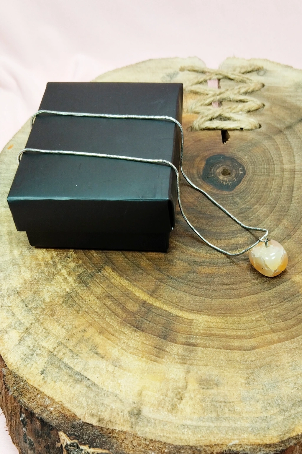 Pembe Akit Doğal Taşı Zincirli El Yapımı Tasarımlı Kolye Uç: 3,5 cm Zincir: 20 cm Kutulu