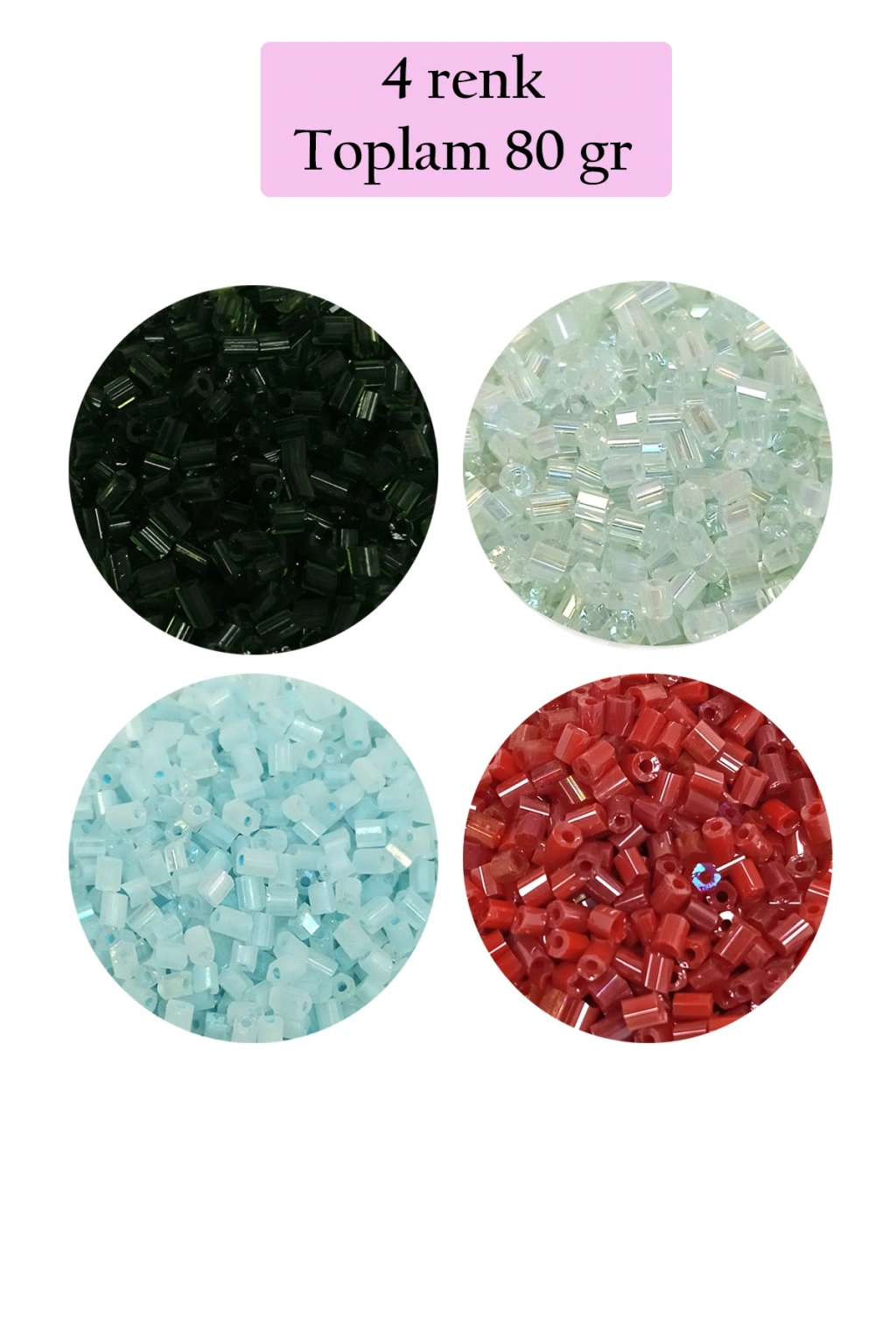 | Kesme Cam Boncuk 2mm - 4 Renk - Toplam 80 Gram - BNC439 Renkler : Şeffaf Koyu Yeşil - Şeffaf Beyaz - Maz Buz Mavi - Koyu Kırmızı Kesme boncuklar camdır. 1 paket yaklaşık 4 Renk Toplam 80 gram boncuk içerir. Kesme boncuklar genelde yazma ve gelinlik gibi elbise süslemelerinde kullanılabilir. |