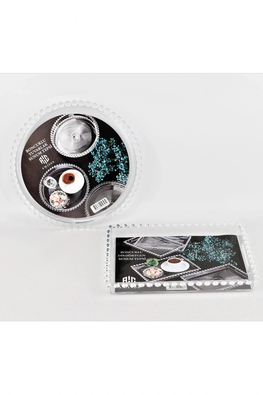 Boncuklu Sunum Tepsisi, Şeffaf Tepsi, Çay Tepsisi, Sunumluk 23 Cm