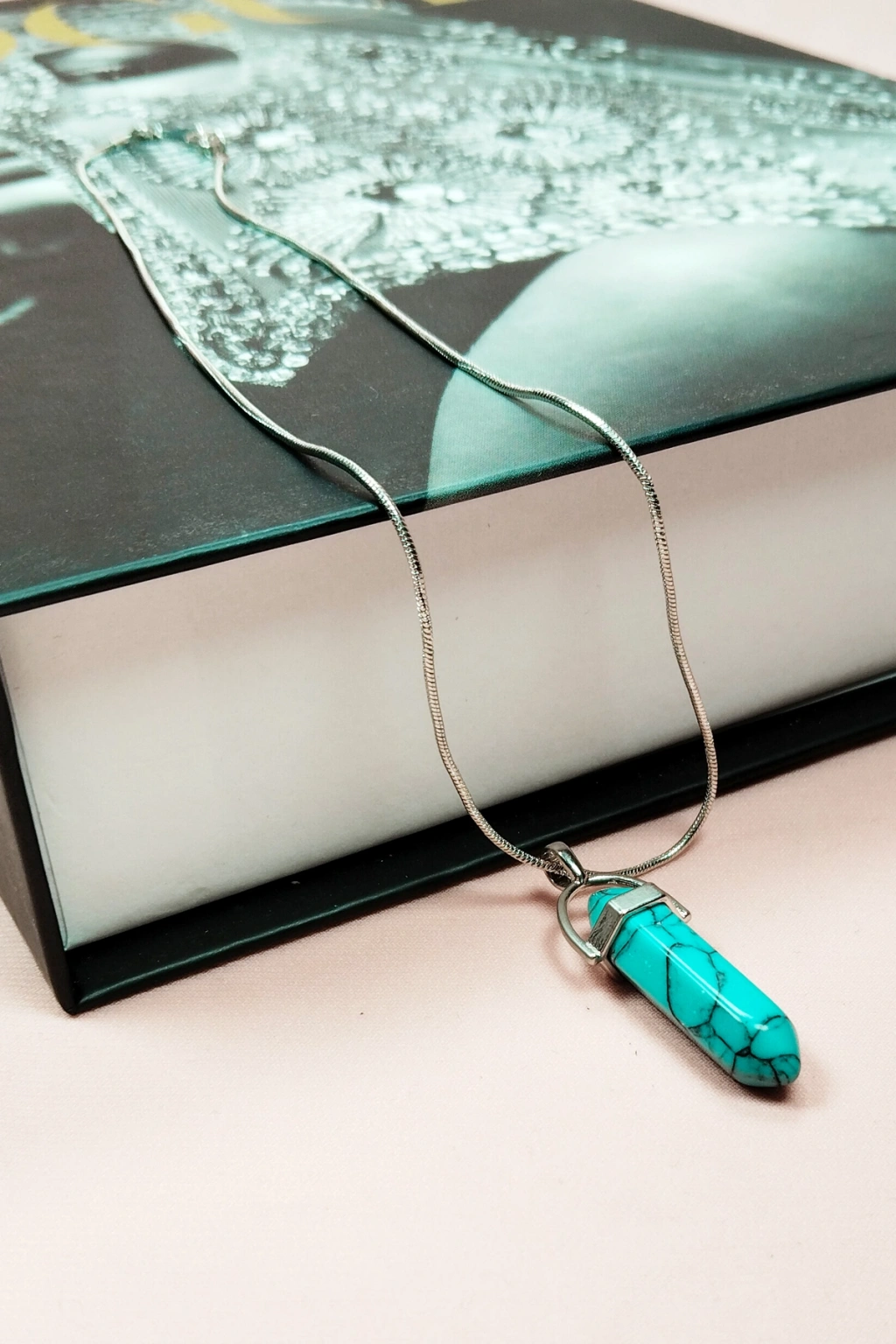 Turkuaz Doğal Taşı Zincirli El Yapımı Tasarımlı Kolye Uç: 3,5 cm Zincir: 20 cm Kutulu